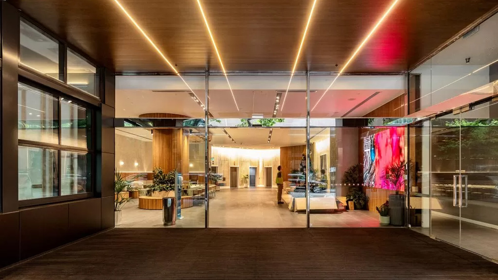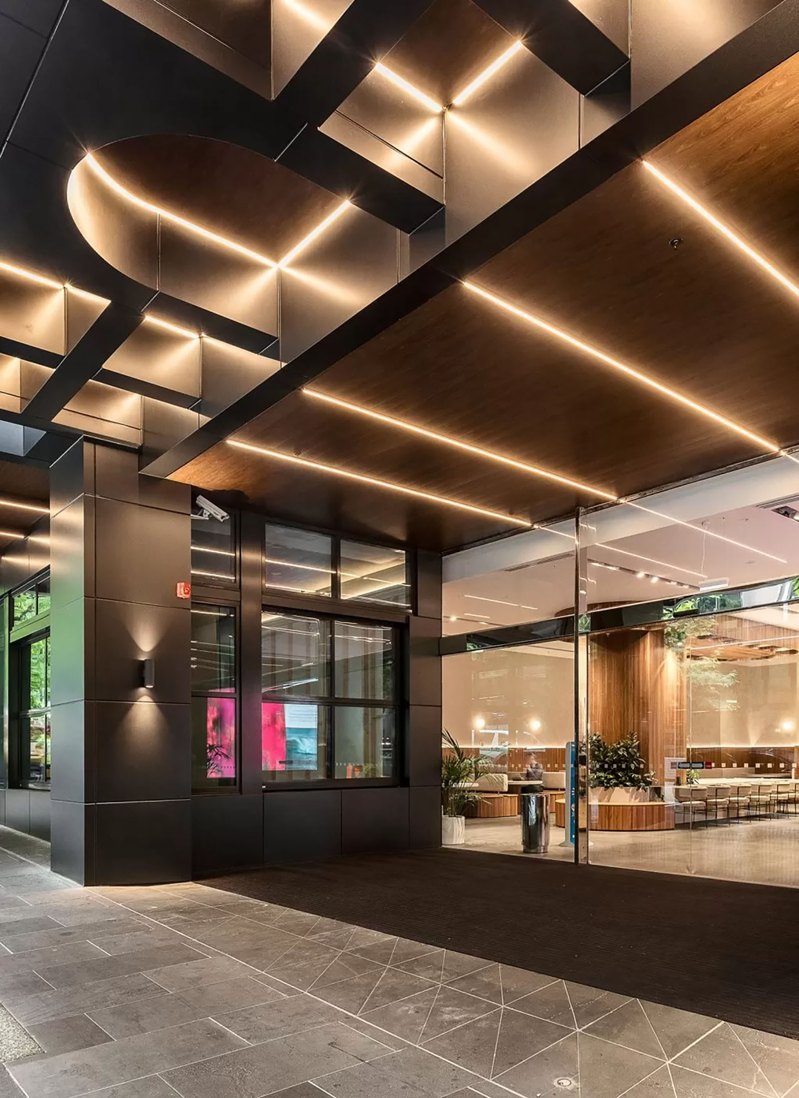 Alclad played a key role in this multifaceted redesign, replacing the building’s combustible ACP façade with durable solid aluminium - an ideal choice that seamlessly complements its city surroundings. The buildings’ main entrance was enhanced with the introduction of a canopy featuring, a stepped design with knotwood cladding and skylights adding further depth to its architecture. Functionality was improved with the installation of operable doors & floor to ceiling glass windows allowing natural light to flow throughout the lobby area. The transformation included the activation of the unused rooftop terrace area, unlocking prime retail and amenity areas with breathtaking city views.